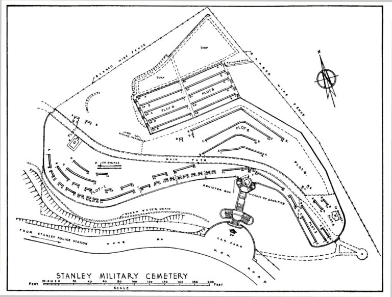 Stanley Military Cemetery is just beyond the town of Stanley in the southern part of Hong Kong island on the Tai Tam Peninsula. From Stanley take the Wong Ma Kok Road. The cemetery is adjacent St Stephen’s College and is close to St Stephen’s beach. It is reached from Victoria by car along a winding, hilly road which at first overlooks the harbour and mainland. After climbing to the pass called Wong Nei Cheng Gap the road descends to the sea at Repulse Bay and then continues along the rocky hillside to Stanley.