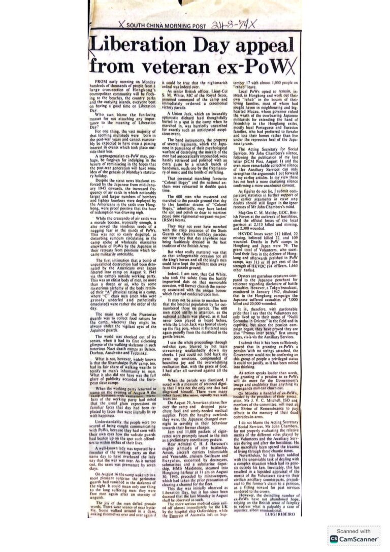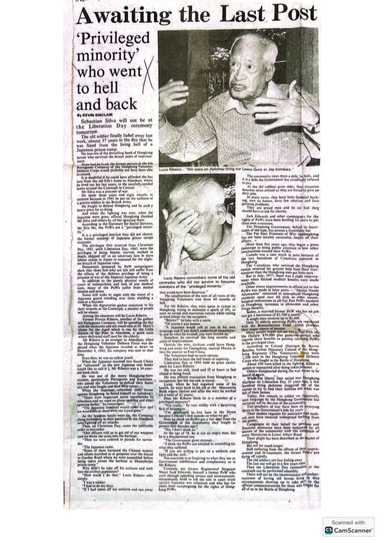 The Volunteers were not afforded this privilege. In fact they were cast aside by the British Colonial authorities to fend for themselves without a pension. Most importantly no healthcare was provided to these men at British Military of Hong Kong Government hospitals to care for the illnesses and trauma caused by their time in the POW camps. My uncle Mem suffered from kidney failure, and he and his family had repeatedly approached the Hong Kong government and the British Army for dialysis treatment at their hospitals to treat his condition. He was not provided any healthcare assistance and died from kidney complications in 1977. Many other Portuguese, Eurasian, Chinese and Indian POWs suffered the same fate (SCMP article ‘Awaiting the Last Post’, 29 August, 1982).