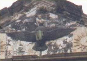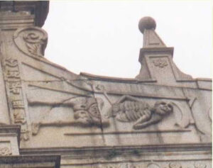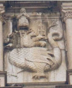 a seven-headed monster with an image of the Virgin Mary above one of its heads and the inscription ‘The woman crushes the dragon’s head’ (Reference: ‘Then a second sign apeared in the sky, a huge red dragon which had seven heads … ‘ Revelation 13:1 and ‘I will put enmity between you and the woman, between your seed and her seed. It will crush your head … ‘ Genesis 3:15)