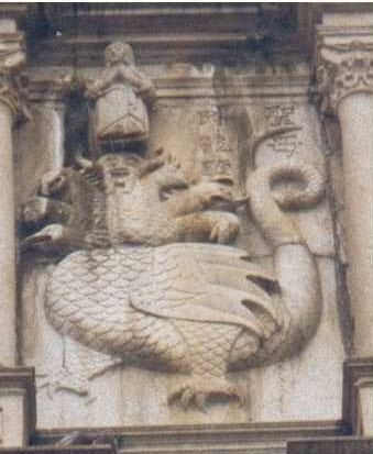um monstro de sete cabeças com uma imagem da Virgem Maria por cima de uma das suas cabeças e a inscrição ‘A mulher esmaga a cabeça do dragão’ (Referência: ‘Depois apareceu um segundo sinal no céu, um enorme dragão vermelho que tinha sete cabeças…’ Apocalipse 13:1 e ‘Porei inimizade entre ti e a mulher, entre a tua descendência e a tua descendência. Ela esmagará a tua cabeça…” Génesis 3:15)