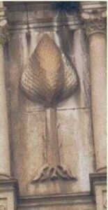 At the centre of the third tier is a statue of the Assumption of the Virgin Mary, with a frieze of chrysanthemums (representing China) and peonies (representing Japan), standing on a large (originally gilt) moon (clearly a reference to the Entrance Antiphon of the Feast of the Assumption: ‘A great sign appeared in heaven: a woman, adorned with the sun, standing on the moon …’ Revelation 12:1). She is surrounded by angels with incense and trumpet. On her left are carved bas-reliefs of: