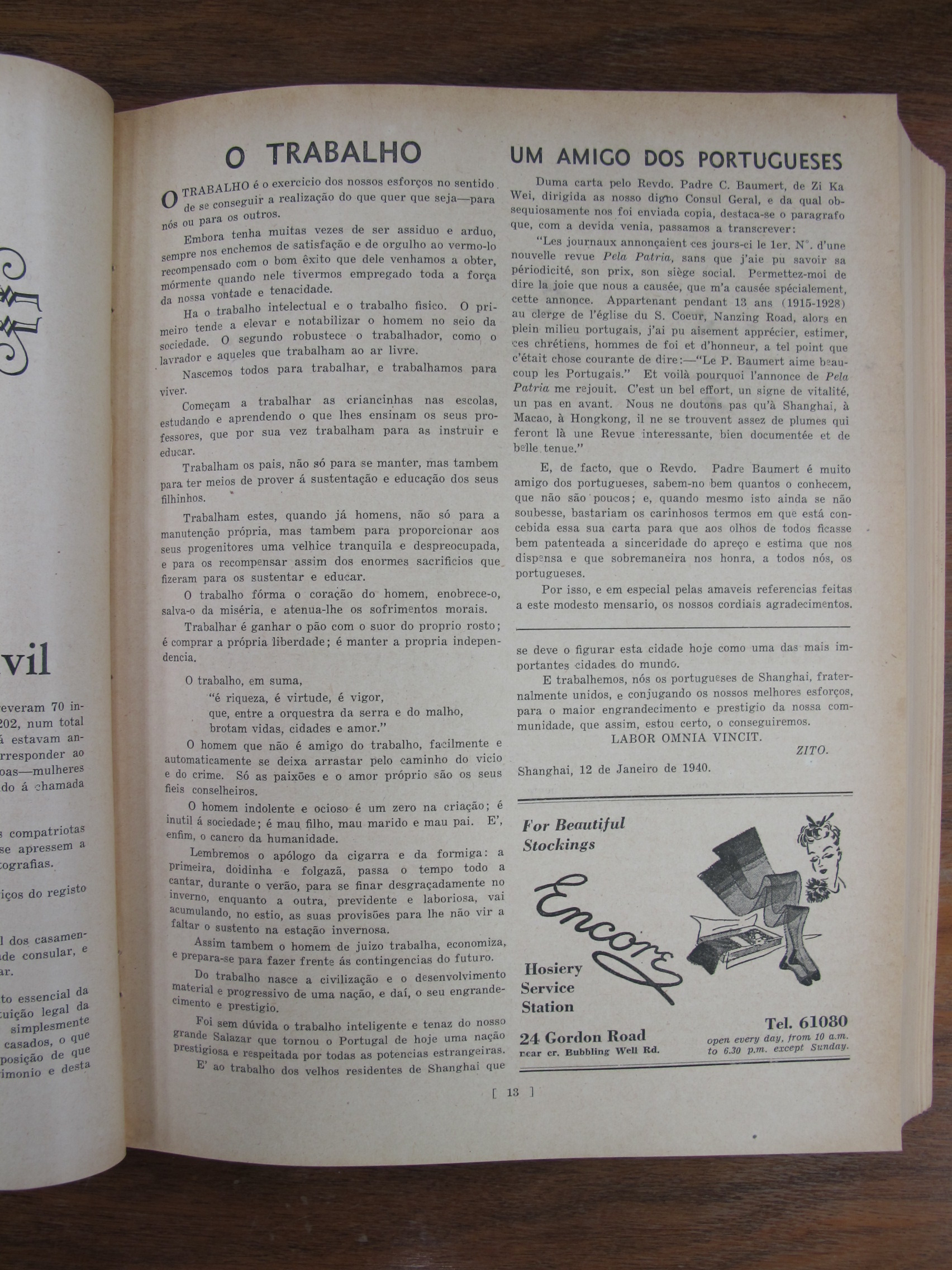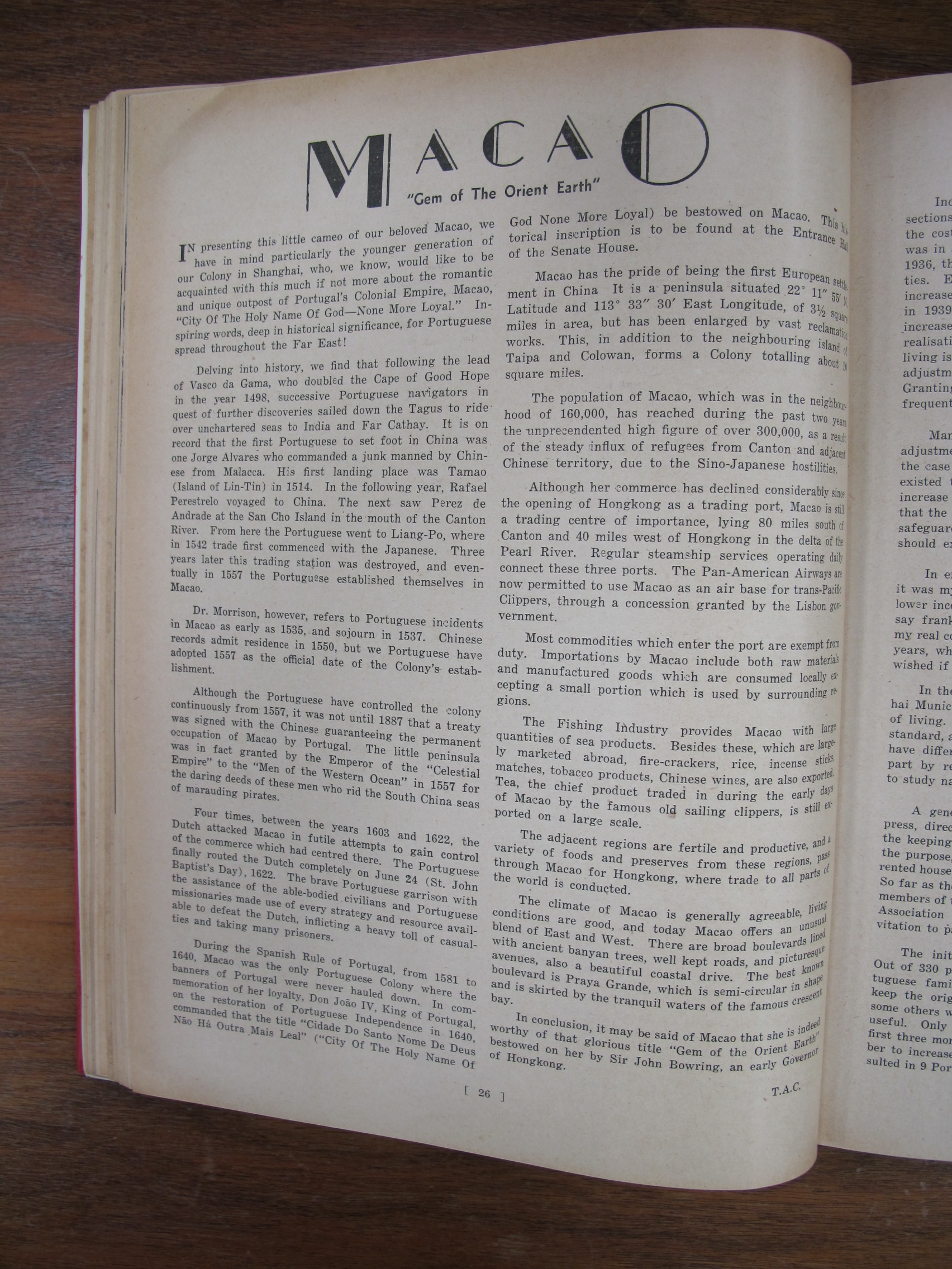 Macao "Gem of the Orient" by TAC – Article mentioning the swelling of population from 160,000 to 300,000 because of the war between China and Japan.