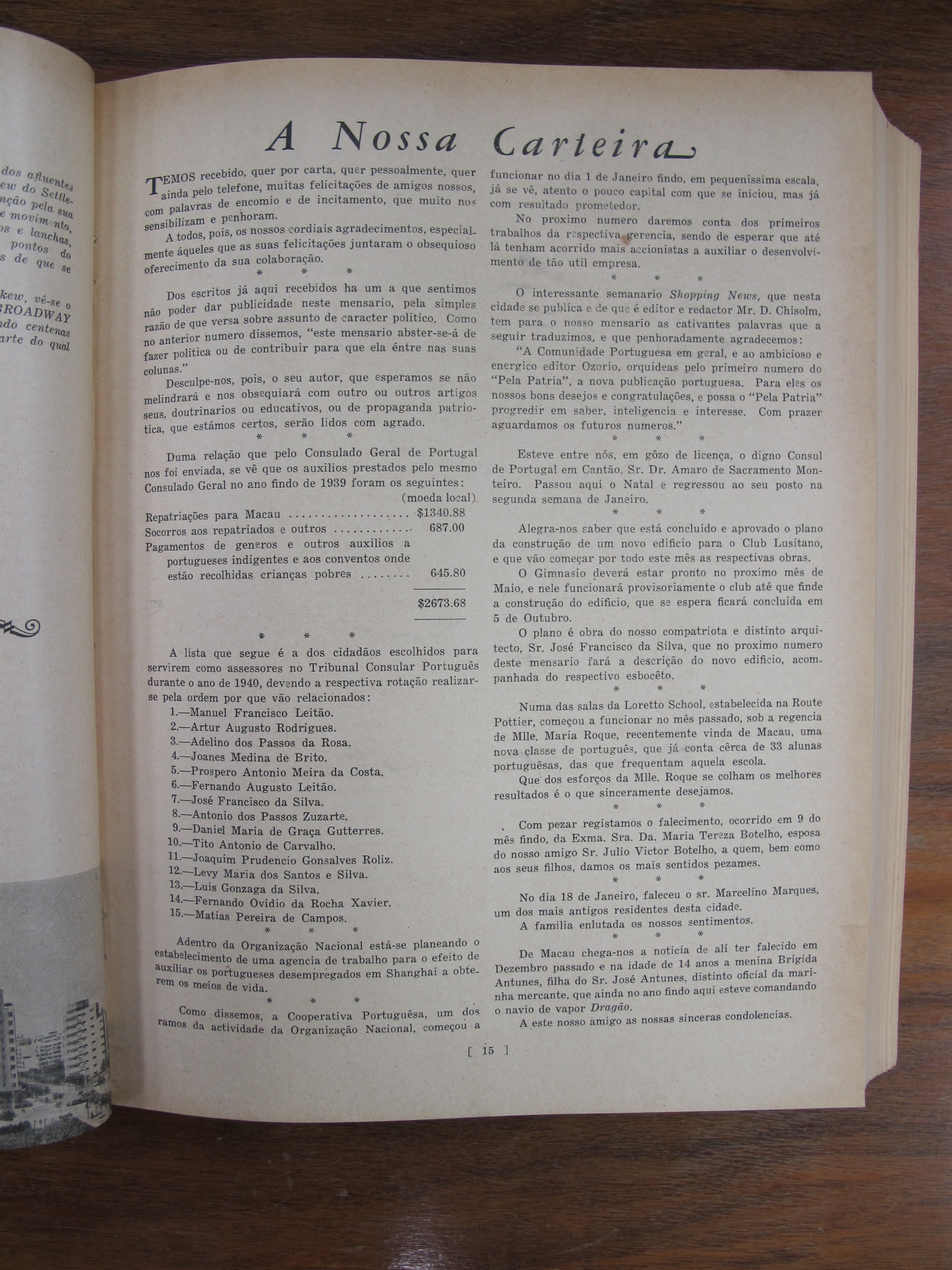 A Nossa Carteira (Our Desk) – Financial report mentioning Major Manuel Francisco Read Leitão, Artur Augusto da Assunção Rodrigues, Adelino Torquato dos Passos da Rosa, João Maria Cornélio Medina "Johannes" de Brito, Prospero Antonio Meira da Costa, Fernando Augusto Leitão, José Francisco da Silva, António dos Passos Zuzarte, Daniel Maria da Graça Gutterres, Tito António de Carvalho, Joaquim Prudêncio Gonçalves Roliz, Levy Maria dos Santos e Silva, Luís Gonzaga Osório da Silva, Fernando Ovídio da Rocha Xavier, Matias Armando Pereira de Campos, Amaro de Sacramento Monteiro, Maria Machado da Costa Roque, Maria Tereza Botelho (wife of Julio Victor Botelho, Marcelino Marques, Brigida Antunes (daughter of José Antunes