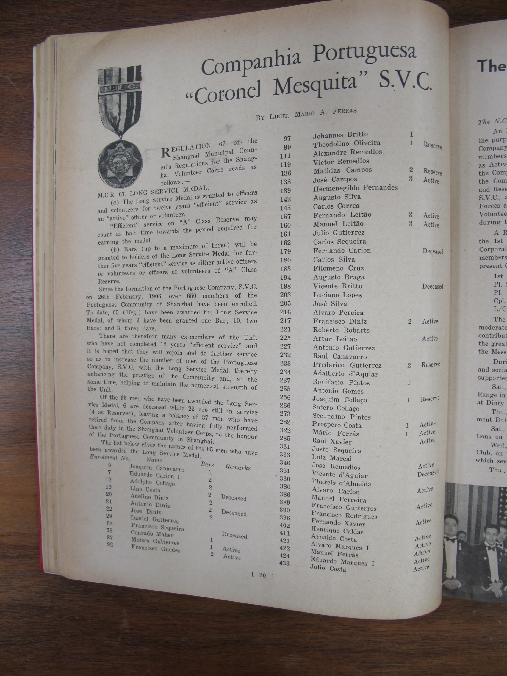 The Social Side of Volunteering by 1st Sgt Manuel A Ferrás with photo of FMF Gutierrez, Fernando Augusto Read Leitão, Fernando Augusto Leitão, PA da Costa,Daniel Maria de Graça Gutteres, A Marques, Joaquim Raul Francisco Collaço, Fernando Ovídio da Rocha Xavier, Mário Augusto Ferras, Teodolino Gilberto Oliveira; photo of NCOs (without names) and mentioning Eduardo Maria dos Passos Marques I, Antero Augusto Marques Guterres da Silva, Alvaro Britto, Augusto Marques,