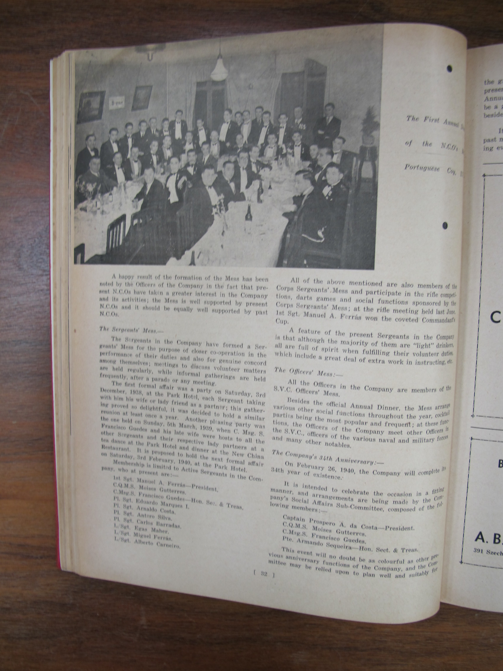 p32 cont. with photo of dinner (without names), mentioning Manuel António Ferras,Moisés Maria Honorato Guterres, Francisco Maria Guedes, Eduardo Maria dos Passos Marques I, Arnaldo Costa, Antero Augusto Marques Guterres da Silva, Carlos Augusto Duarte Barradas, José Egas Moniz Maher, Miguel Ferrás, Alberto José dos Santos Carneiro, Pospero A da Costa, Armando Martino de Sequeira