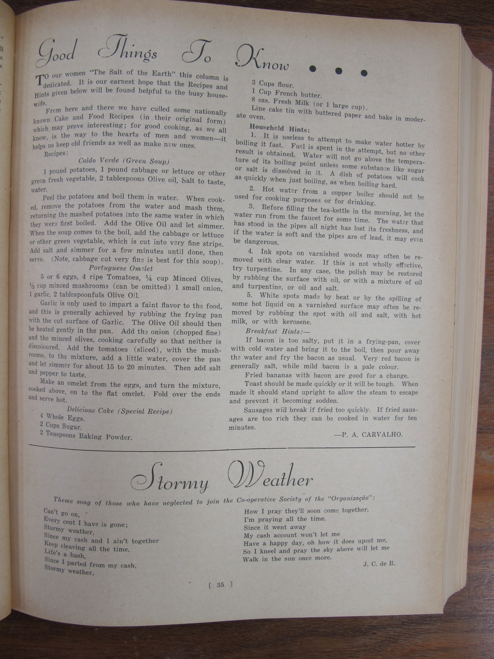 p35 Good Things to Know by Palmira Angelina de Carvalho – Recipes for Caldo Verde, Portuguese Omelet, Cake, and household hints;