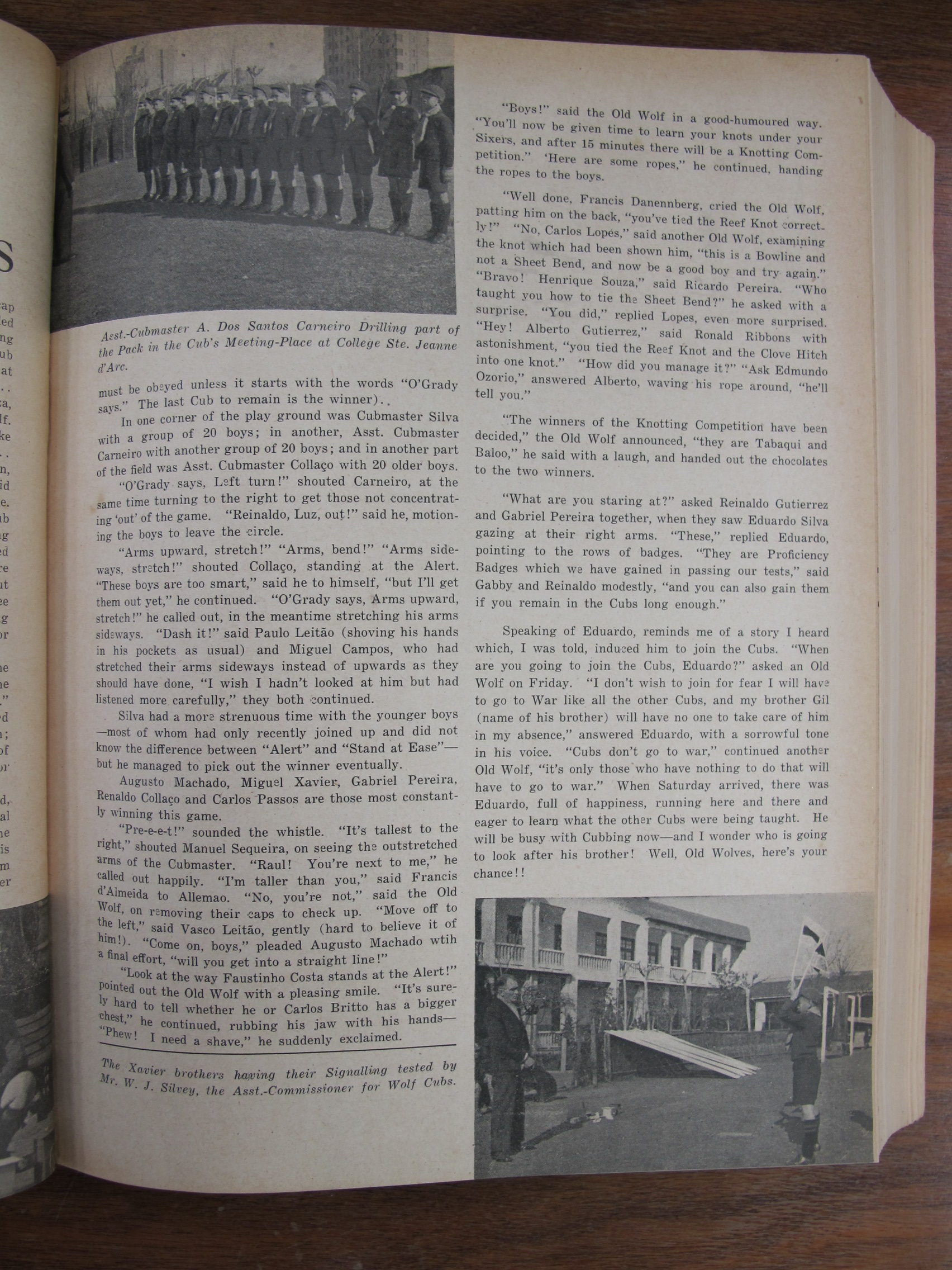 p38 PREVIOUS PAGE MISSING. THIS PAGE UNNUMBERED Photo of boy scouts with A dos Santos, Cubmaster Silva, Asst. Cubmaste Carneiro and Collaço; photo of Xavier brothers; mentioning Luz, Raul, Paulo Leitão, Miguel Francisco de Campos, Augusto José Machado, Miguel Armando de Carvalho Stuart Xavier, Gabriel Pereira, Reinaldo "Ronnie" Collaço, Carlos Passos, Francis d'Almeida, Allemão, Vasco [Artur] Leitão, Artur [António] Leitão, Faustinho Costa, Carlos Britto, Frnacis Dannenberg, Carlos Lopes, Henrique Souza, Ricardo Alberto Pereira, Alberto Gutierrez, Ronald Ribbons, Edmundo Ozorio, Reinaldo Gutierrez, Eduardo Silva,