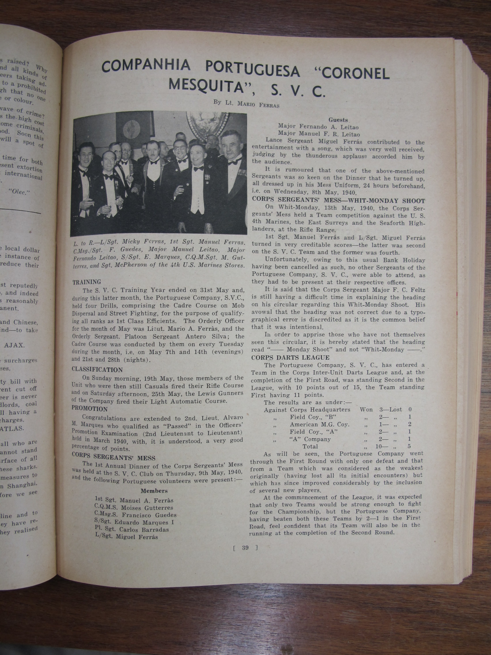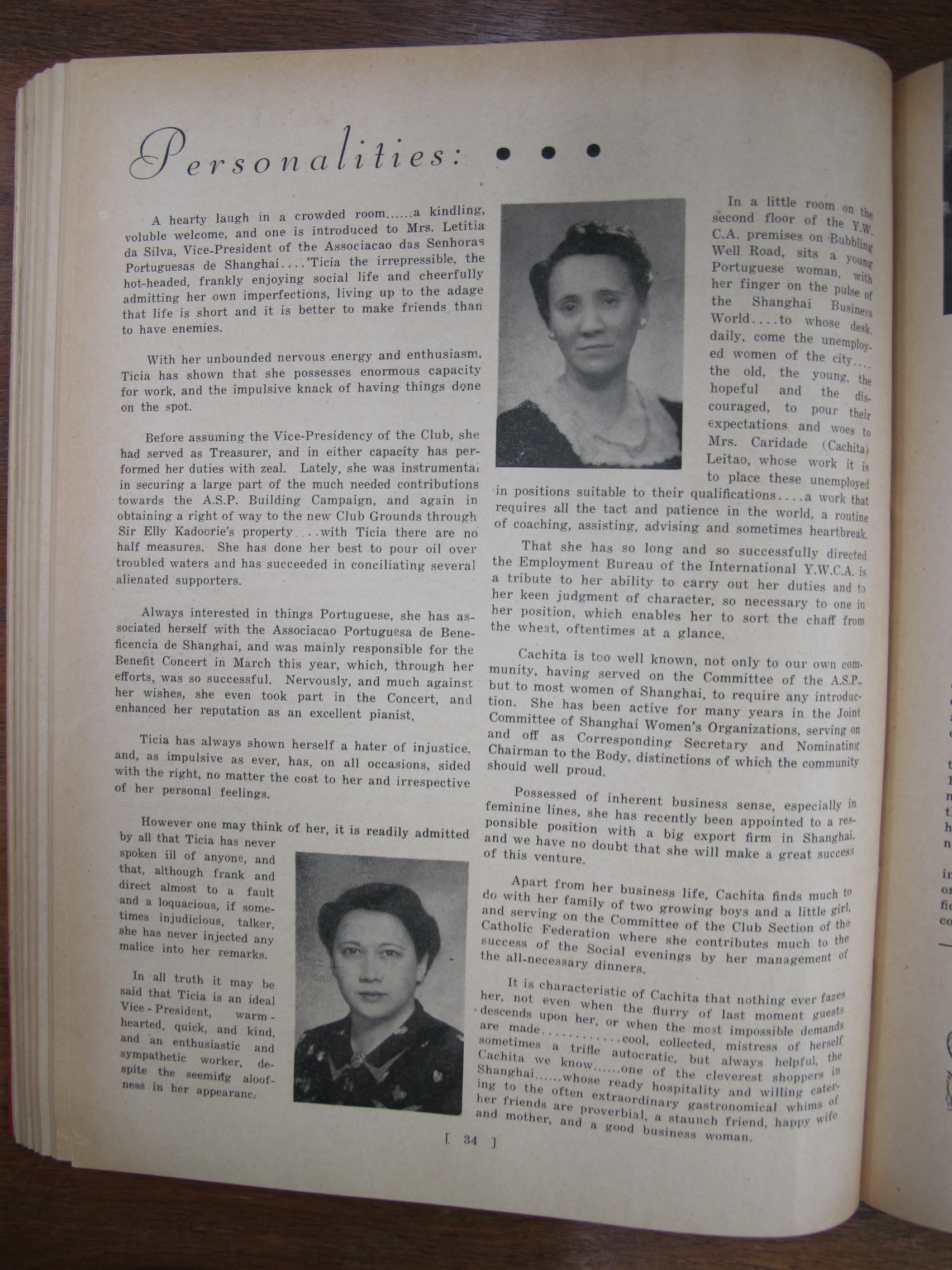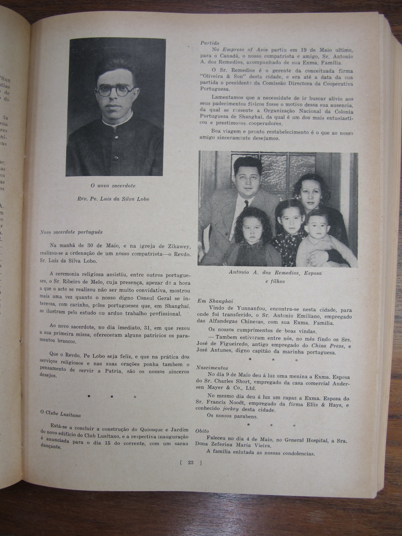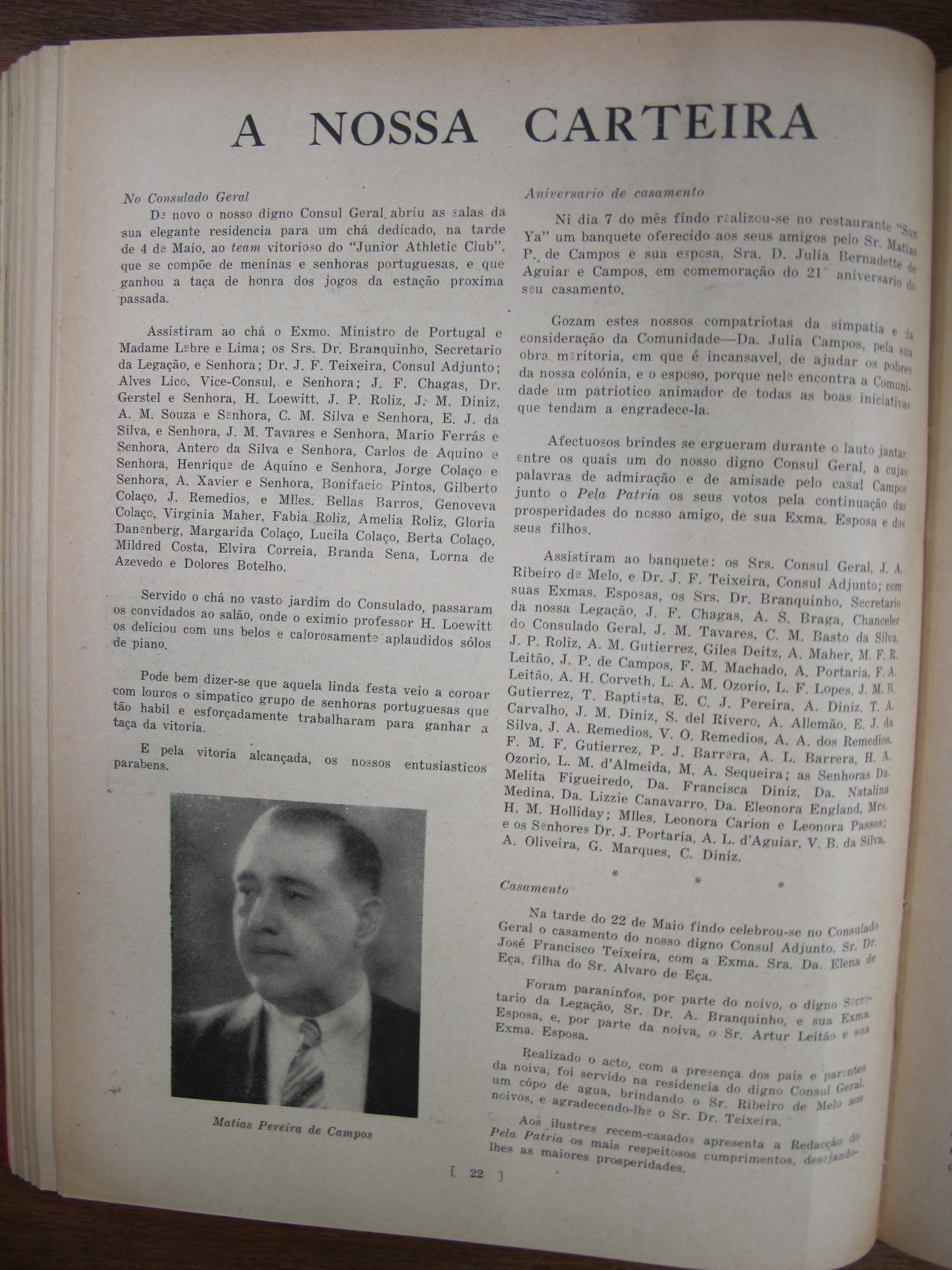 A Nossa Carteira (Our Desk), mentioning José Francisco Teixeira, Alves Lico, JF Chagas, Joaquim Prudêncio Gonçalves Roliz, JM Diniz, AM Souza, CM Silva, EJ da Silva, JM Tavares, Mário Augusto Ferras, Antero Augusto Marques Guterres da Silva, Carlos de Aqino, Henrique de Aquino, Jorge Colalço, A Xavier, Bonifácio Estevão Pintos, Gilberto Braz Collaço, J Remedios, Bellas Barros, Genoveva Colalço, Virginia Maher, Fábia Esperança Colaço Roliz, Maria Amélia Tiaga Colaço Roliz, Glória Maria Danenberg, Margarida Colalço, Lucila Colalço, Berta Colalço, Mildred Costa, Elvira Antónia "Elvie" Correa[Correia], Branda Sena, Lorna de Azevedo, Dolores Botelho, JF Chagas, AS Braga, CM Basto da Silva, AM Gutierrez, Giles Deitz, A Maher, Major Manuel Francisco Read Leitão, JP de Campos, FM Machado, A Portaria, Fernando Augusto Read Leitão, AH Corveth, LAM Ozorio, LF Lopes, JMR Gutierrez, T Baptista, ECJ Pereira, A Diniz, Tito António de Carvalho, JM Diniz, S del Rivero, A Allemão, EJ da Silva, JA Remedios, VO Remedios, AA dos Remedios, FMF Gutierrez, PJ Barrera, AL Barrera, HA Ozorio, LM d'Almeida, MA Sequeira, Melita Figueiredo, Francisca Diniz, Natalina Medina, Lizzie Canavarro, Eleonora England, Leonora Carion, Leonora Passos, J Portaria, AL d'Aguiar, VB da Silva, A Oliveira, G Marques, C Diniz, Artur Leitão