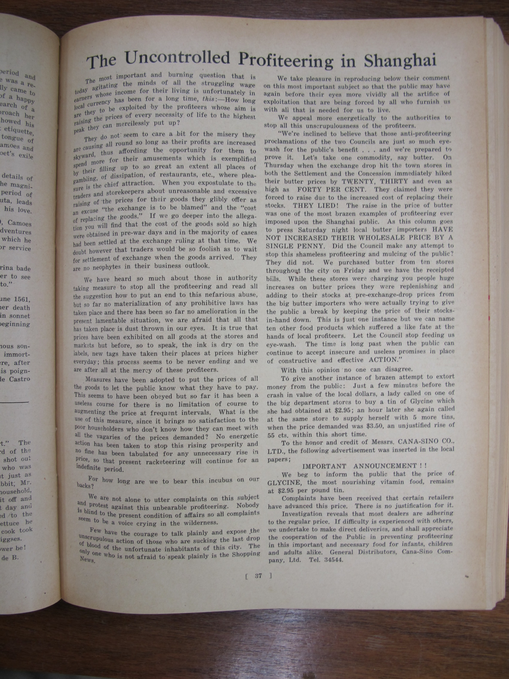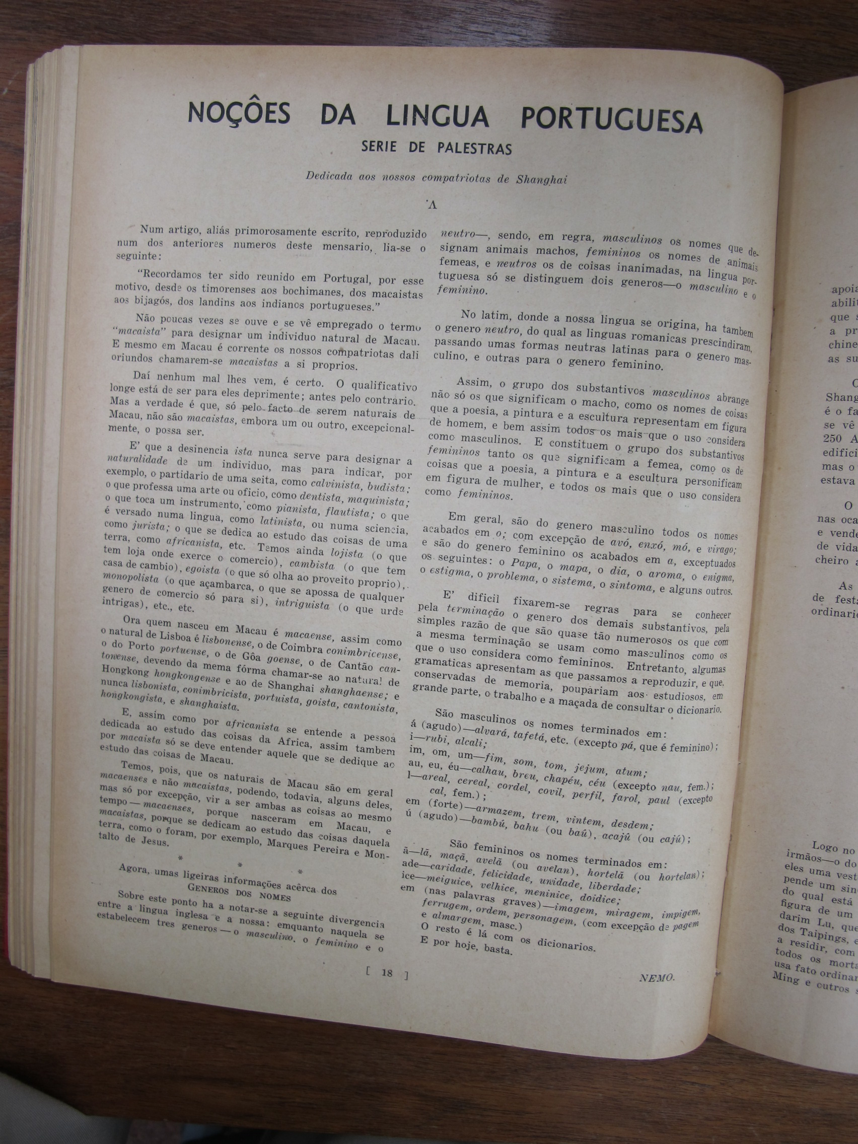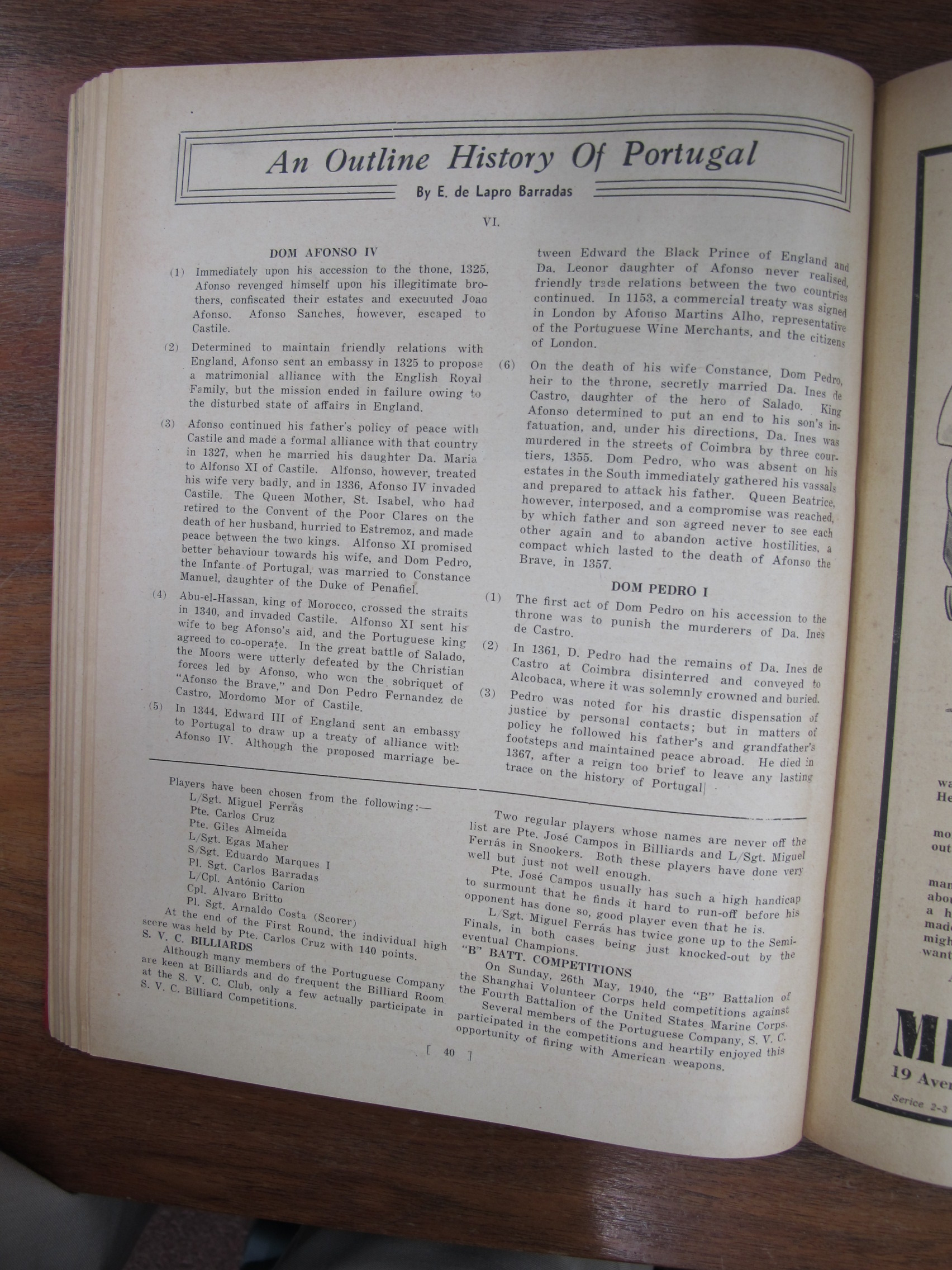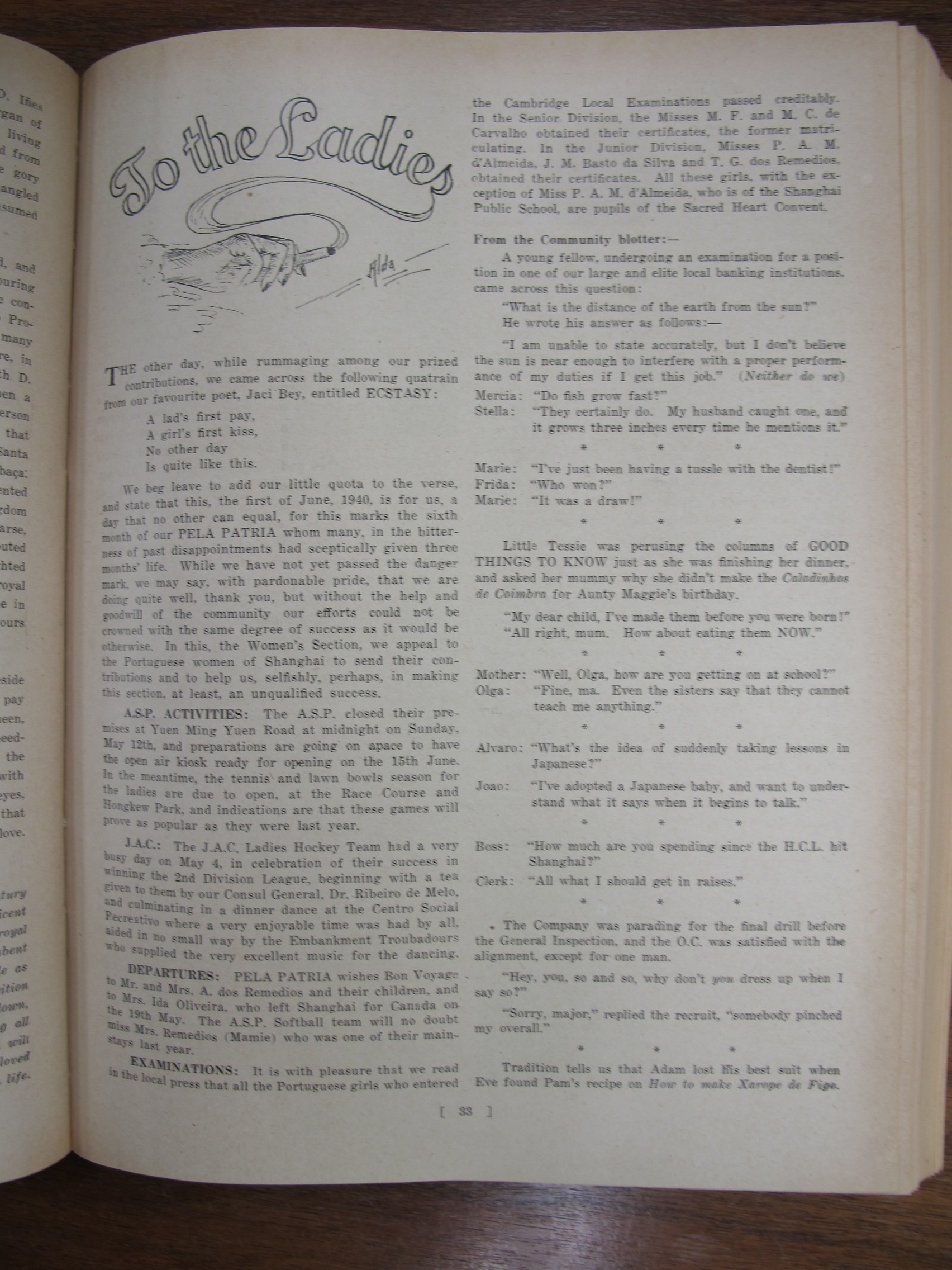 A Nossa Carteira (Our Desk), mentioning José Francisco Teixeira, Alves Lico, JF Chagas, Joaquim Prudêncio Gonçalves Roliz, JM Diniz, AM Souza, CM Silva, EJ da Silva, JM Tavares, Mário Augusto Ferras, Antero Augusto Marques Guterres da Silva, Carlos de Aqino, Henrique de Aquino, Jorge Colalço, A Xavier, Bonifácio Estevão Pintos, Gilberto Braz Collaço, J Remedios, Bellas Barros, Genoveva Colalço, Virginia Maher, Fábia Esperança Colaço Roliz, Maria Amélia Tiaga Colaço Roliz, Glória Maria Danenberg, Margarida Colalço, Lucila Colalço, Berta Colalço, Mildred Costa, Elvira Antónia "Elvie" Correa[Correia], Branda Sena, Lorna de Azevedo, Dolores Botelho, JF Chagas, AS Braga, CM Basto da Silva, AM Gutierrez, Giles Deitz, A Maher, Major Manuel Francisco Read Leitão, JP de Campos, FM Machado, A Portaria, Fernando Augusto Read Leitão, AH Corveth, LAM Ozorio, LF Lopes, JMR Gutierrez, T Baptista, ECJ Pereira, A Diniz, Tito António de Carvalho, JM Diniz, S del Rivero, A Allemão, EJ da Silva, JA Remedios, VO Remedios, AA dos Remedios, FMF Gutierrez, PJ Barrera, AL Barrera, HA Ozorio, LM d'Almeida, MA Sequeira, Melita Figueiredo, Francisca Diniz, Natalina Medina, Lizzie Canavarro, Eleonora England, Leonora Carion, Leonora Passos, J Portaria, AL d'Aguiar, VB da Silva, A Oliveira, G Marques, C Diniz, Artur Leitão
