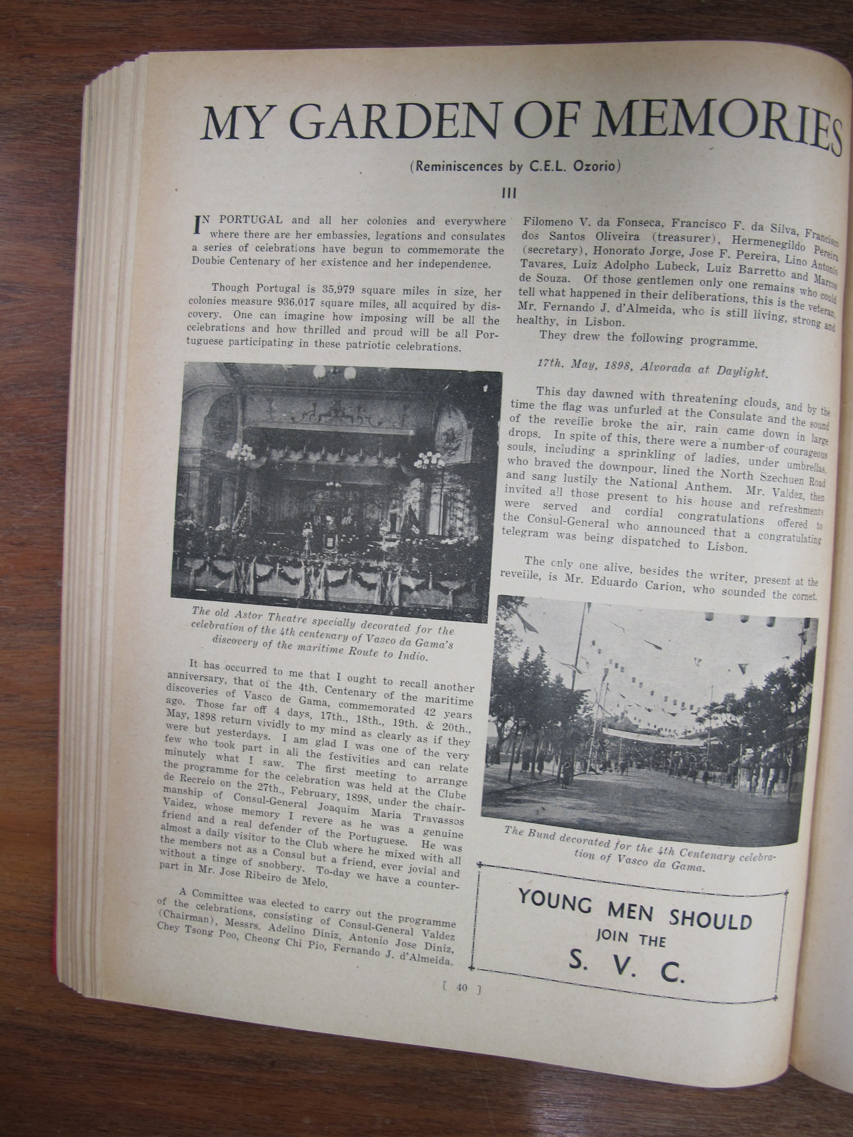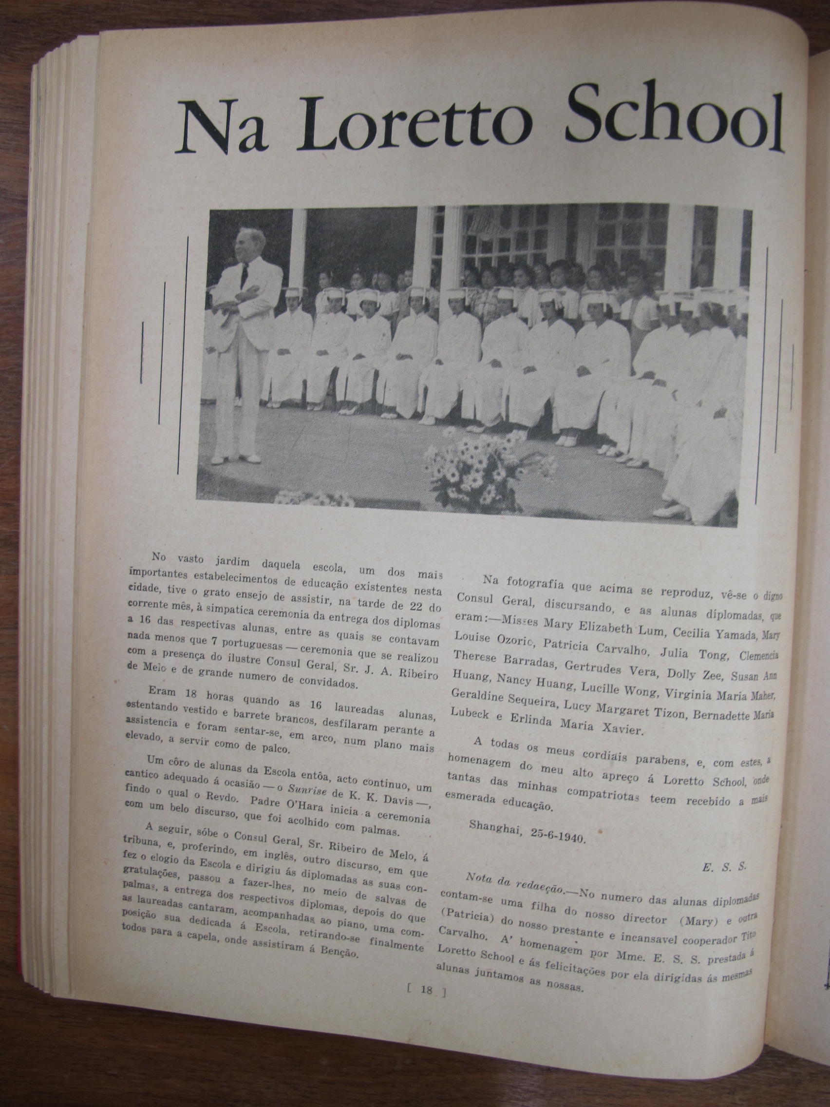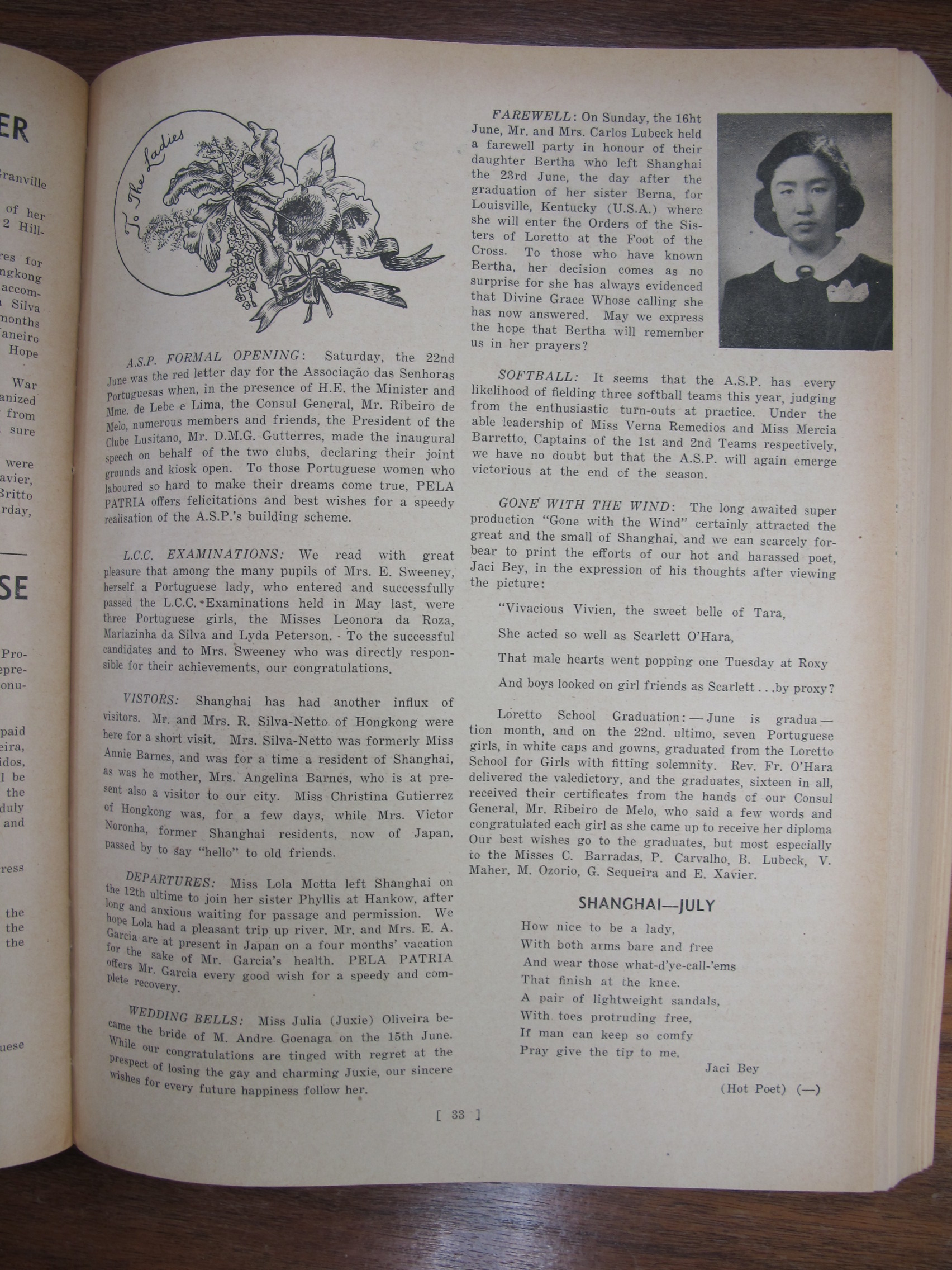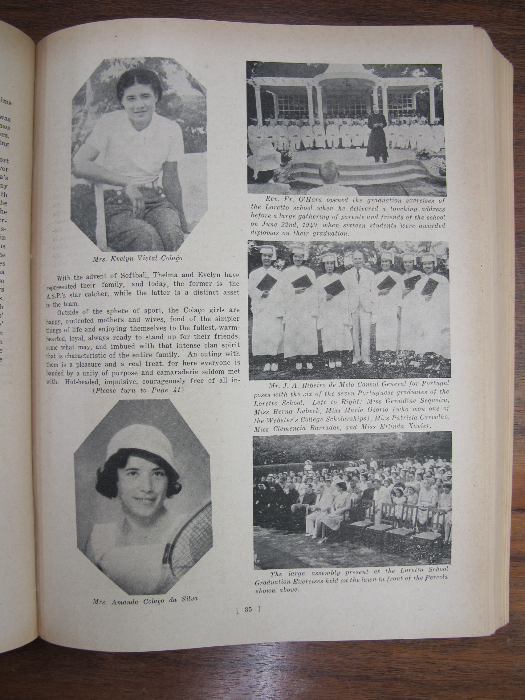 p33 To the Ladies mentioning Daniel Maria de Graça Gutteres, Mrs E Sweeney, Leonora da Roza, Mariazinha da Silva, Lyda Peterson, R. Silva-Netto, Annie Barnes Silva-Netto and her mother of Mrs Angelina Barnes, Christina Gutierrez, Mrs Victor Noronha, Miss Lola Motta and her sister Phyullis, EA Garcia. Announcing the marriage of Júlia Miriam "Juxie" de Oliveira and Andre Goenaga on 15 June; the departure to Louisville, Kentucky, of Bertha, daughter of Mr and Mrs Carlos Borromeu Jorge Lubeck, and mentioning her sister Berna who will enter the Orders of the Sisters of Loretto at the Foot of the Cross. Mentioning Verna Myra dos Remédios, Mercia Barretto, Jaci Bey, Misses C Barradas, Patrícia Maria de Carvalho, Bernardette Marie Lubeck, V Maher, M Ozorio, G Sequeira, E Xavier. Poem by Jaci Bey