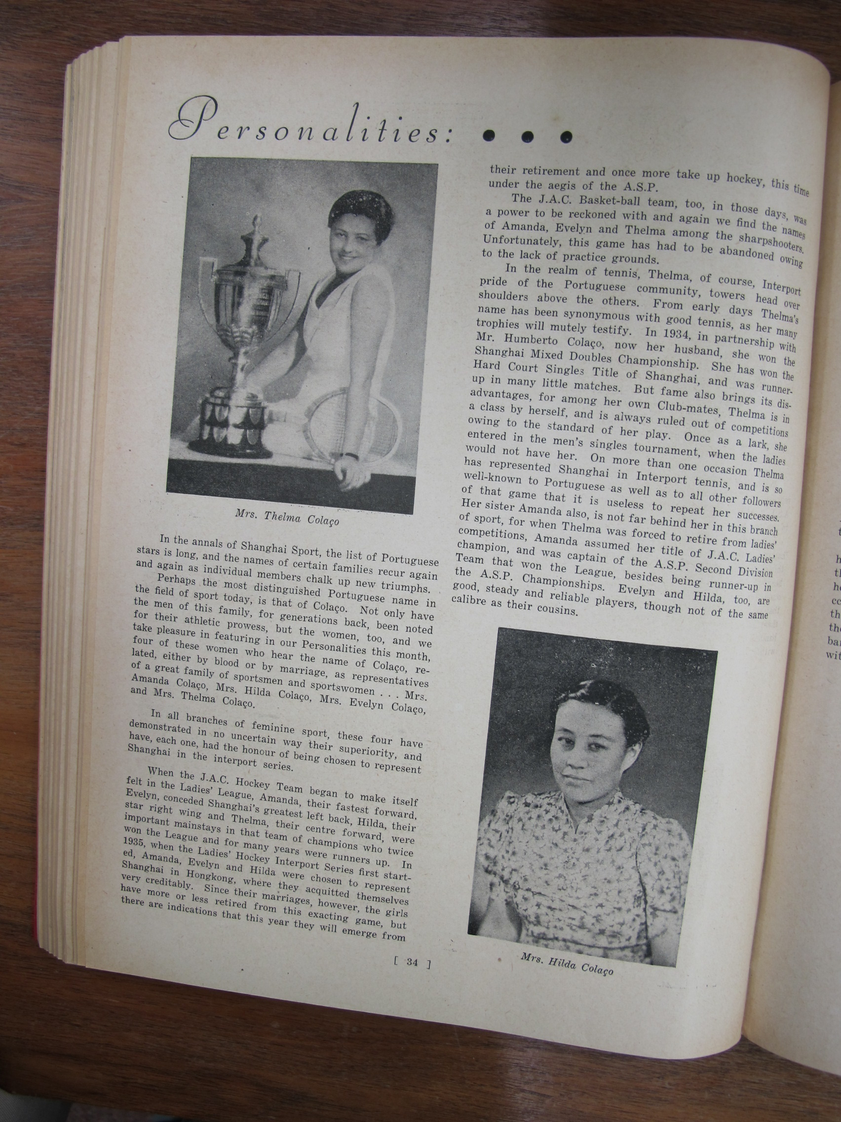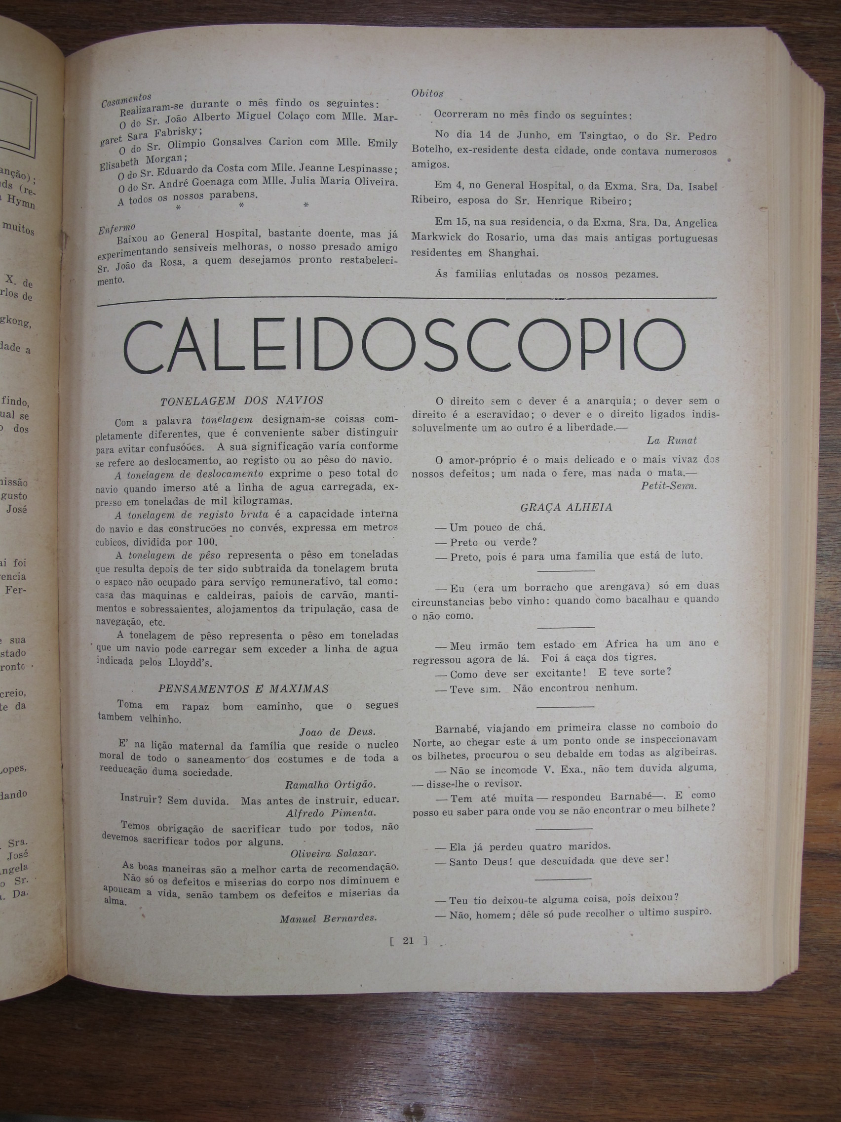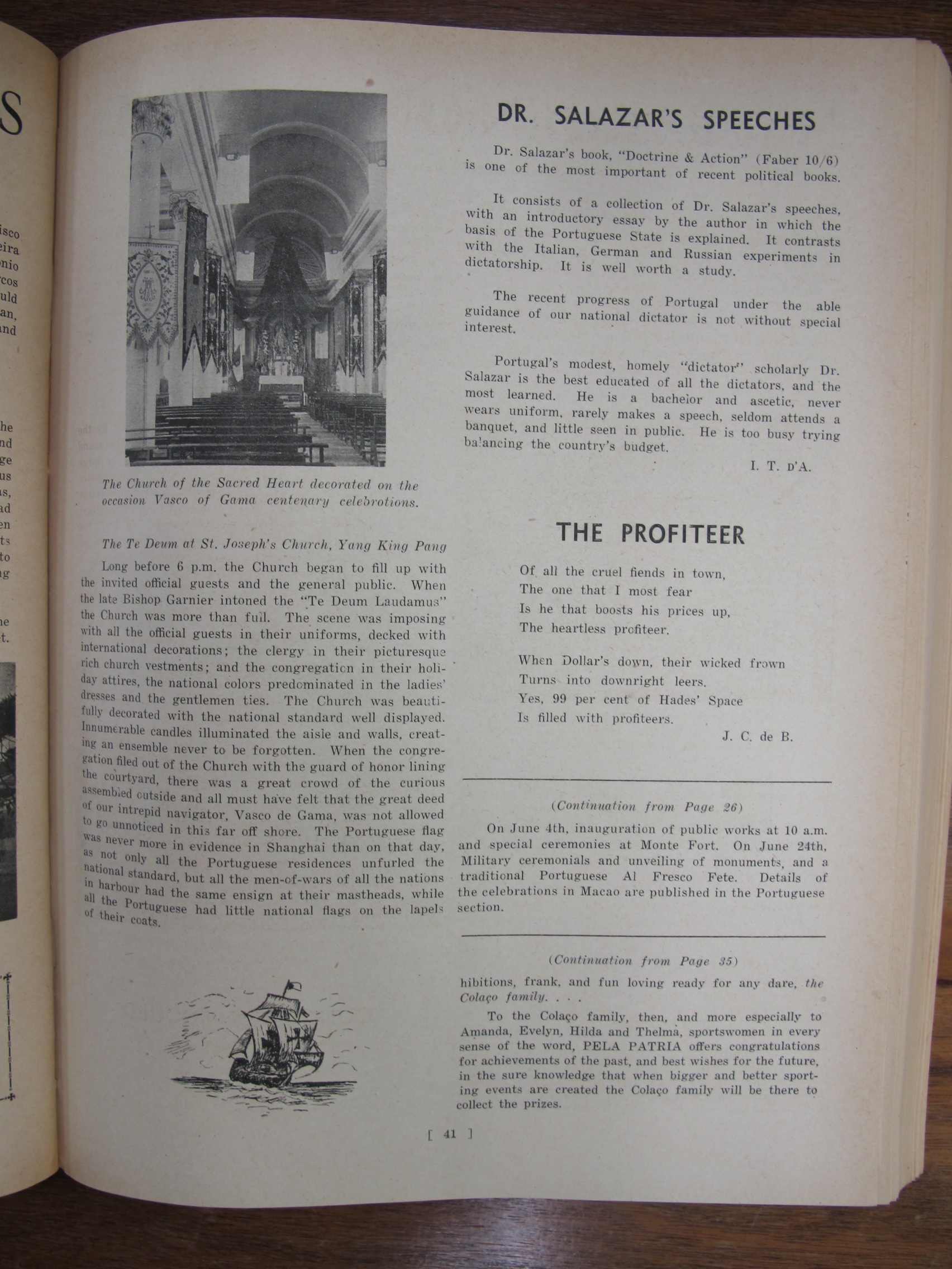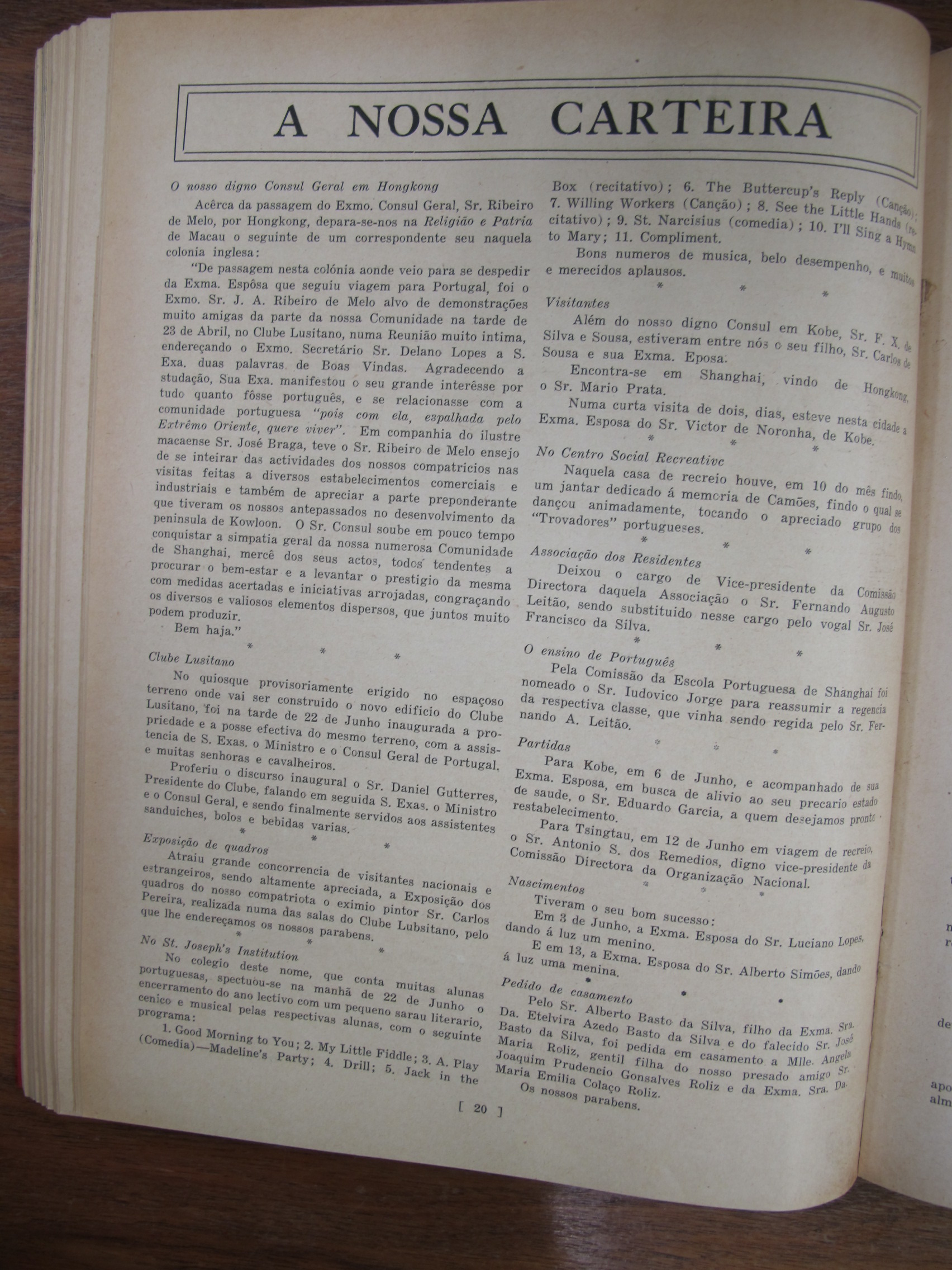 p33 To the Ladies mentioning Daniel Maria de Graça Gutteres, Mrs E Sweeney, Leonora da Roza, Mariazinha da Silva, Lyda Peterson, R. Silva-Netto, Annie Barnes Silva-Netto and her mother of Mrs Angelina Barnes, Christina Gutierrez, Mrs Victor Noronha, Miss Lola Motta and her sister Phyullis, EA Garcia. Announcing the marriage of Júlia Miriam "Juxie" de Oliveira and Andre Goenaga on 15 June; the departure to Louisville, Kentucky, of Bertha, daughter of Mr and Mrs Carlos Borromeu Jorge Lubeck, and mentioning her sister Berna who will enter the Orders of the Sisters of Loretto at the Foot of the Cross. Mentioning Verna Myra dos Remédios, Mercia Barretto, Jaci Bey, Misses C Barradas, Patrícia Maria de Carvalho, Bernardette Marie Lubeck, V Maher, M Ozorio, G Sequeira, E Xavier. Poem by Jaci Bey