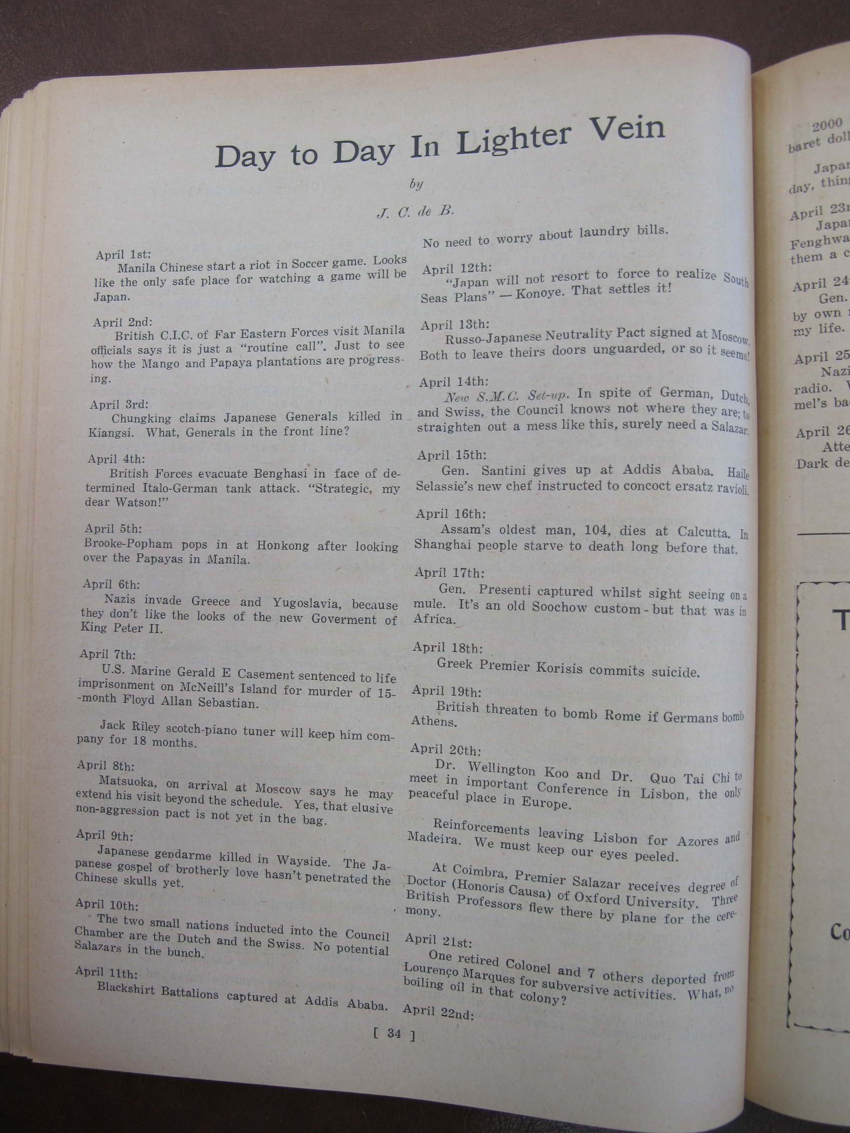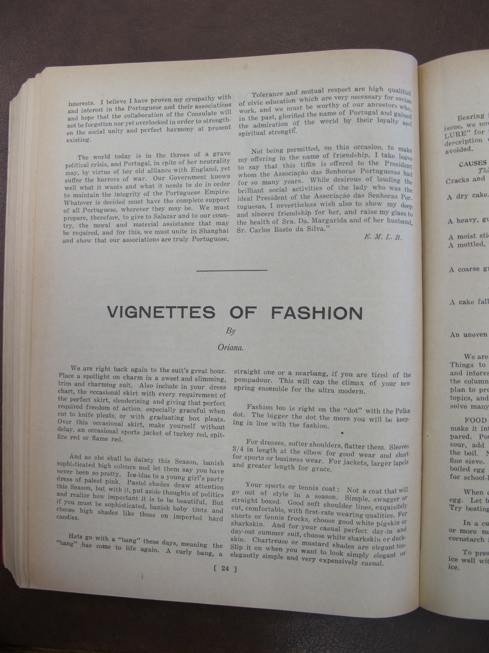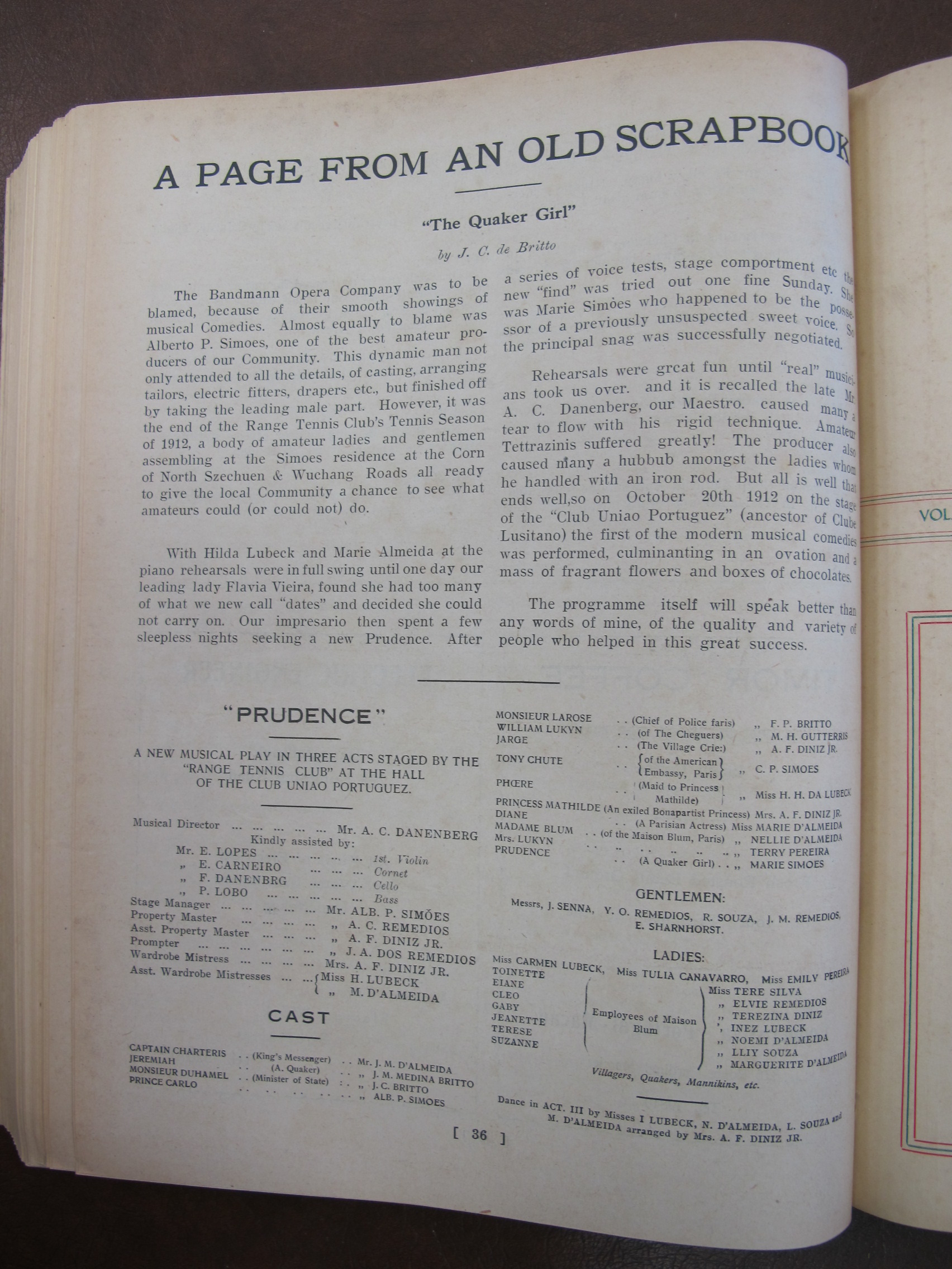 A Page from an Old Scrapbook: "The Quaker Girl" by Jane Catherina de Brito [Britto], mentioning Alberto P Simoes, Flavia Vieira, Hilda Maria Tavares Lubeck Lubeck, Marie Almeida [Marie d'Almeida], Marie Simoes, AC Danenberg