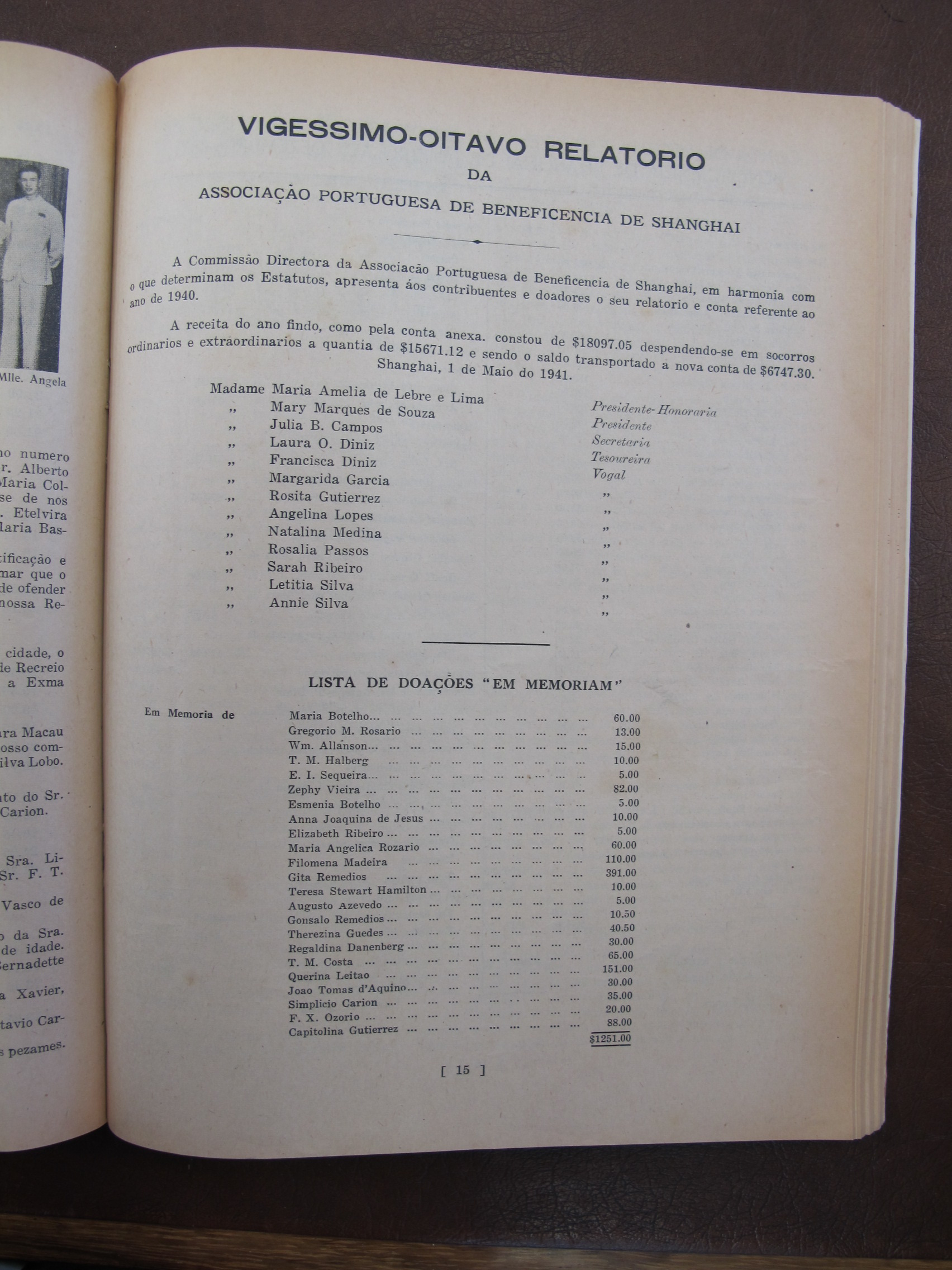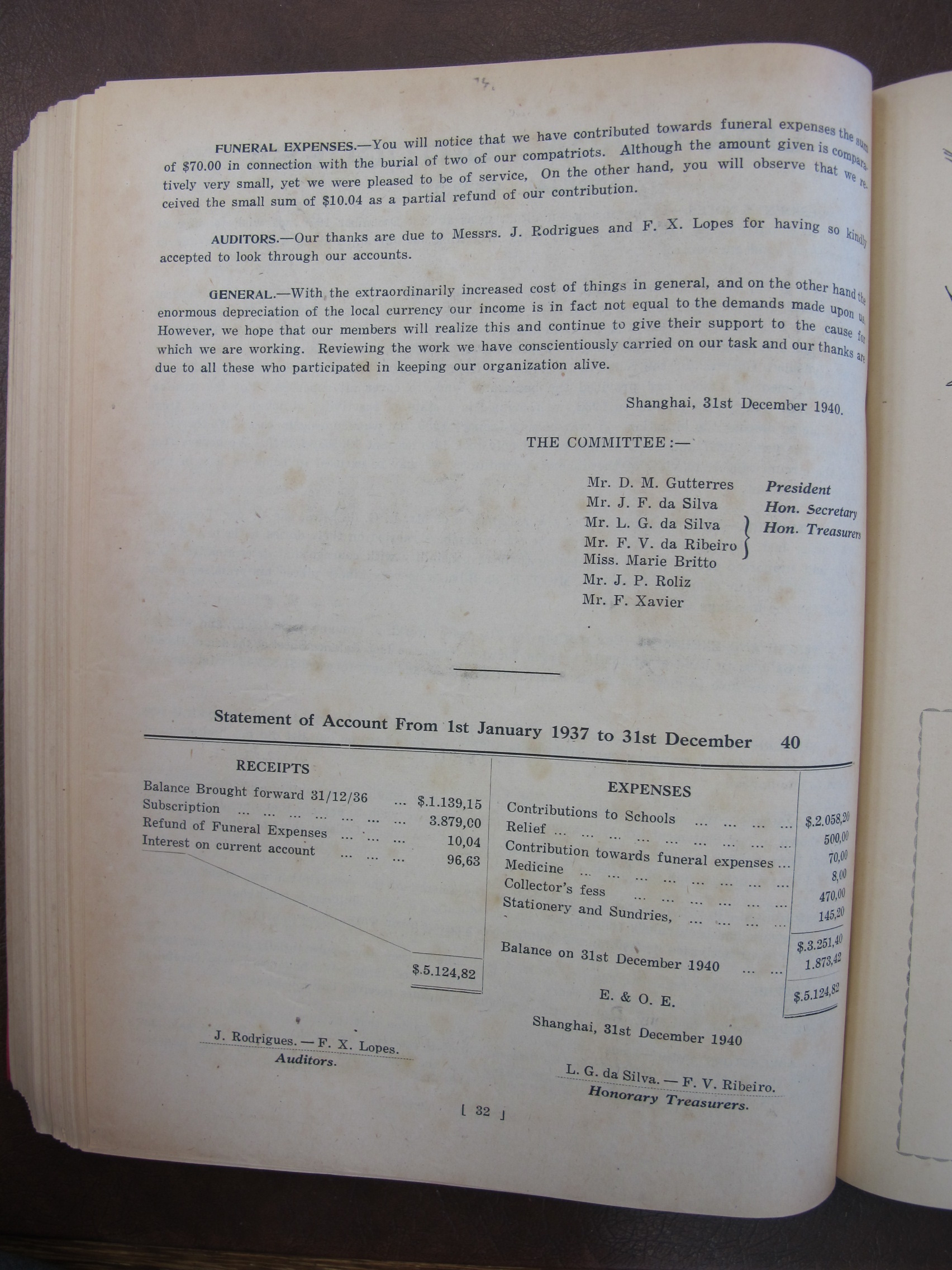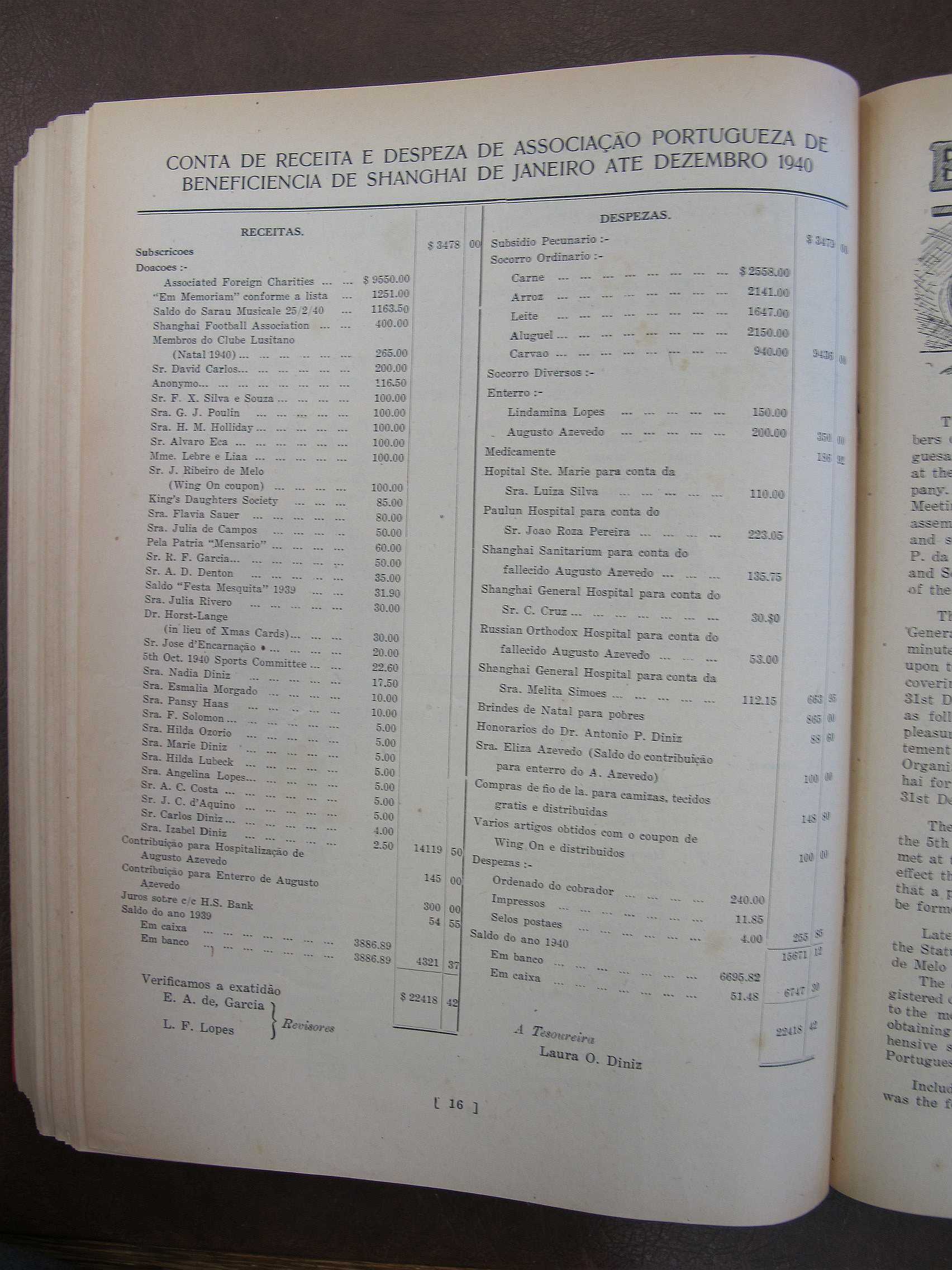 p16 Conta de Receita e Despeza de Associação Portugueza de Beneficencia de Shanghai de Janeiro até Dezembro 1940 (Receipts and Expenditure, Jan-Dec 1940) mentioning Dr Antonio P Diniz, Laura O Diniz, EA de Garacia, LF Lopes, Francisco Xavier da Silva e Souza, GJ Poulin, HM Holliday [